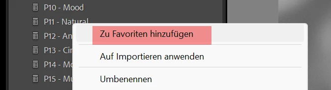 Ich nutze diverse LR Presets von diversen Anbietern. Die Besten daraus habe ich jeweils durch Drücken der rechten Maustatste "zu Favoriten hinzufügen" eben zu den Favoriten hinzugefügt. So erscheint auch in der Palette der Presets oben ein Menu "Favoriten".