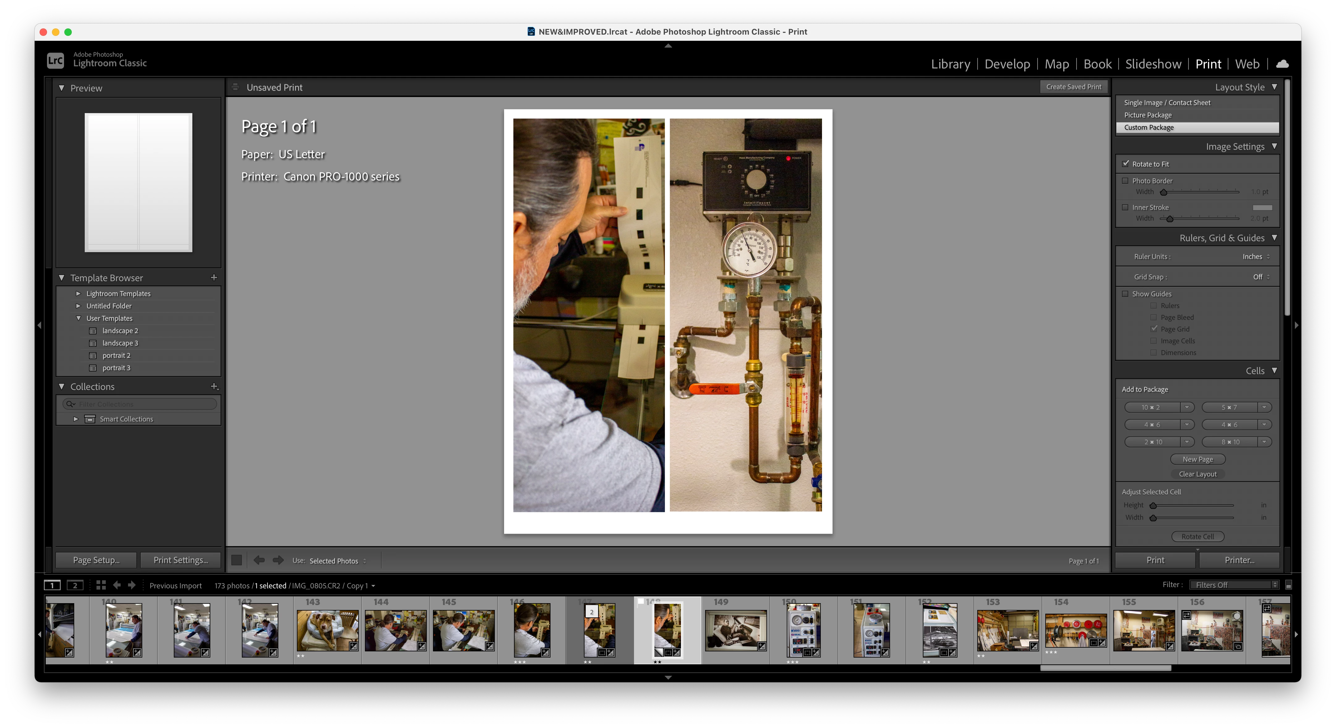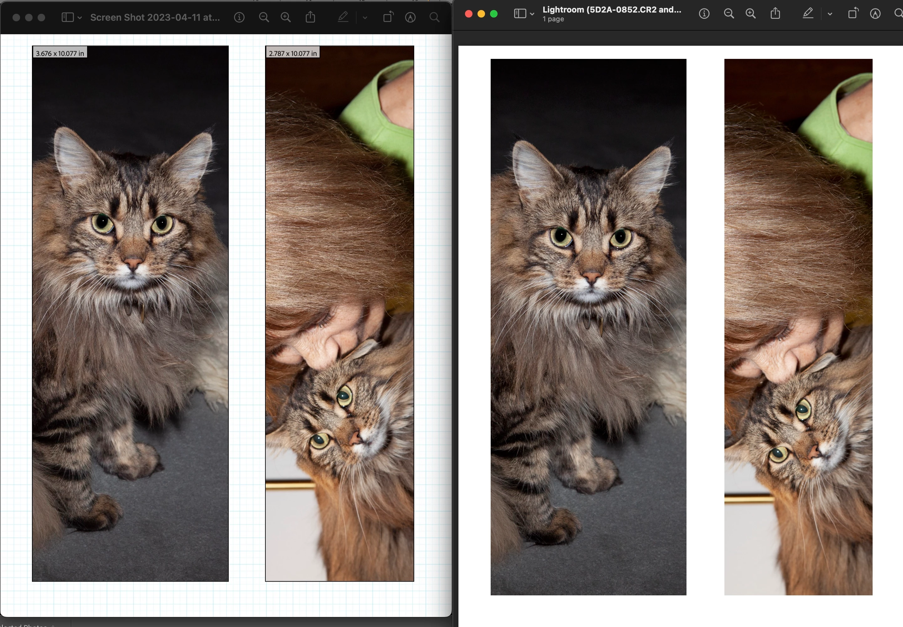 Hi - Apologies for the ham-handed explanation. I am working with version 12.2.1 of Adobe Lightroom under MacOS 11.7.1 (Big Sur) and am encountering an issue with images cropped differently than I select when printing with a custom package in the print module. I have a custom package setup on US letter-sized paper with two narrow vertical cells. I am able to place the images I want to print into the cells, then use the command-click and drag to set the image for printing. However, when I print the images, invariably one of the cells will be incorrectly cropped. I am able to adjust the crop in the cell independently (they are different images and do not change when I change one cell)... but on ouput... either to print or PDF... one of the images will have a completely different crop. Attaching a screenshot and a photo of output to give you an idea of what is going on...