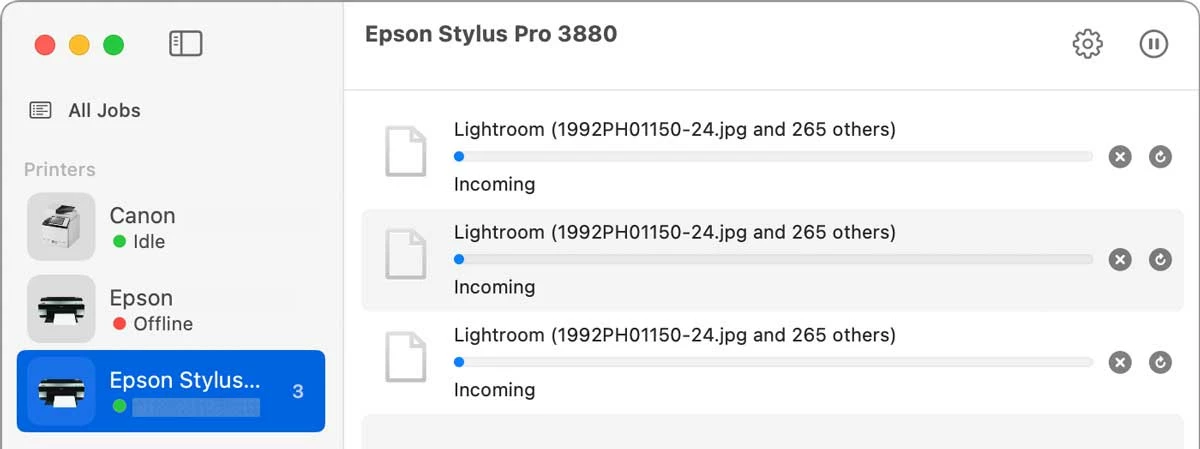 As each print job exits the application, the next stop is the macOS printing queue, which sequences print jobs received from any applications on your computer to any printers connected to your computer. Shown below are the three jobs received by macOS from Lightroom Classic, which are now lining up in macOS Print Center for the final trip to the printer.