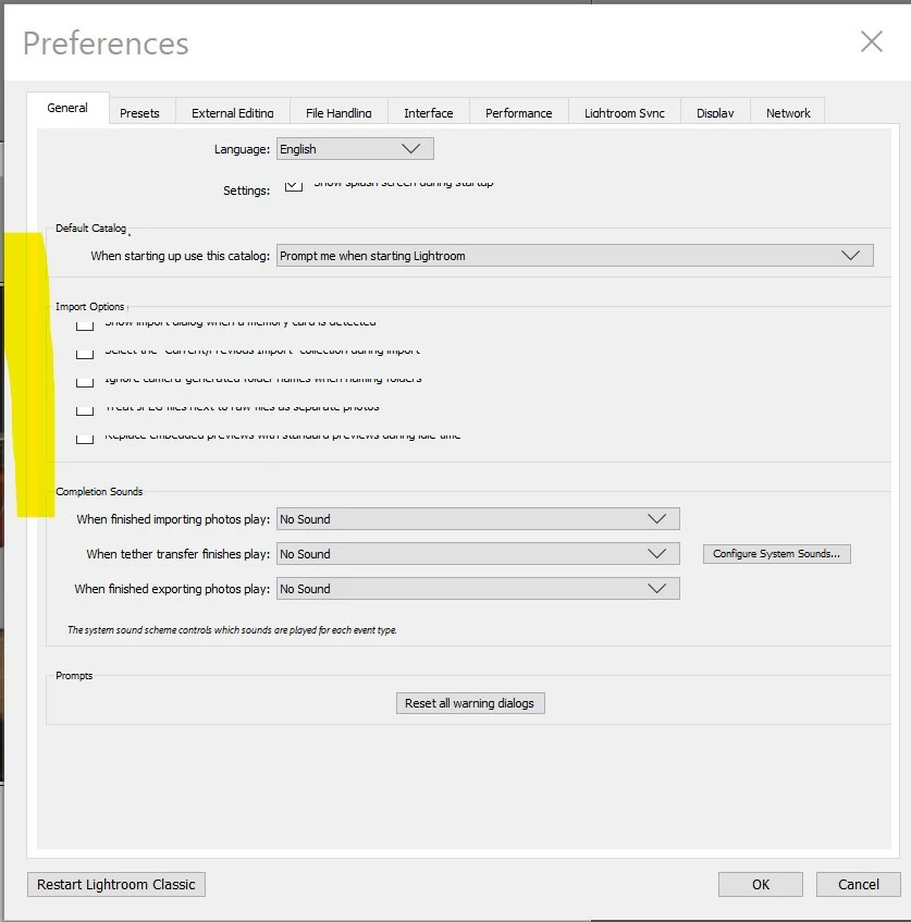 Which version of Lightroom are you using? Since when has this started? Is it happening just to the import options of Lightroom preferences? Have you tried re-login into the application?