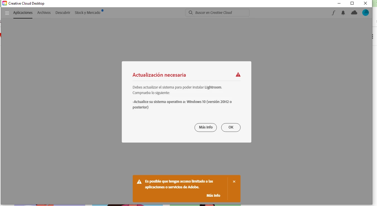 Buenas noches, les comento que compre el Plan para obtener Ligthroom, pero me solicita que mi Windows sea la version 20h2, tengo instalada la version 21h2 y me dice incompatible, actualice a la version 22h2 y sigue saliendo lo mismo, alguna ayuda?