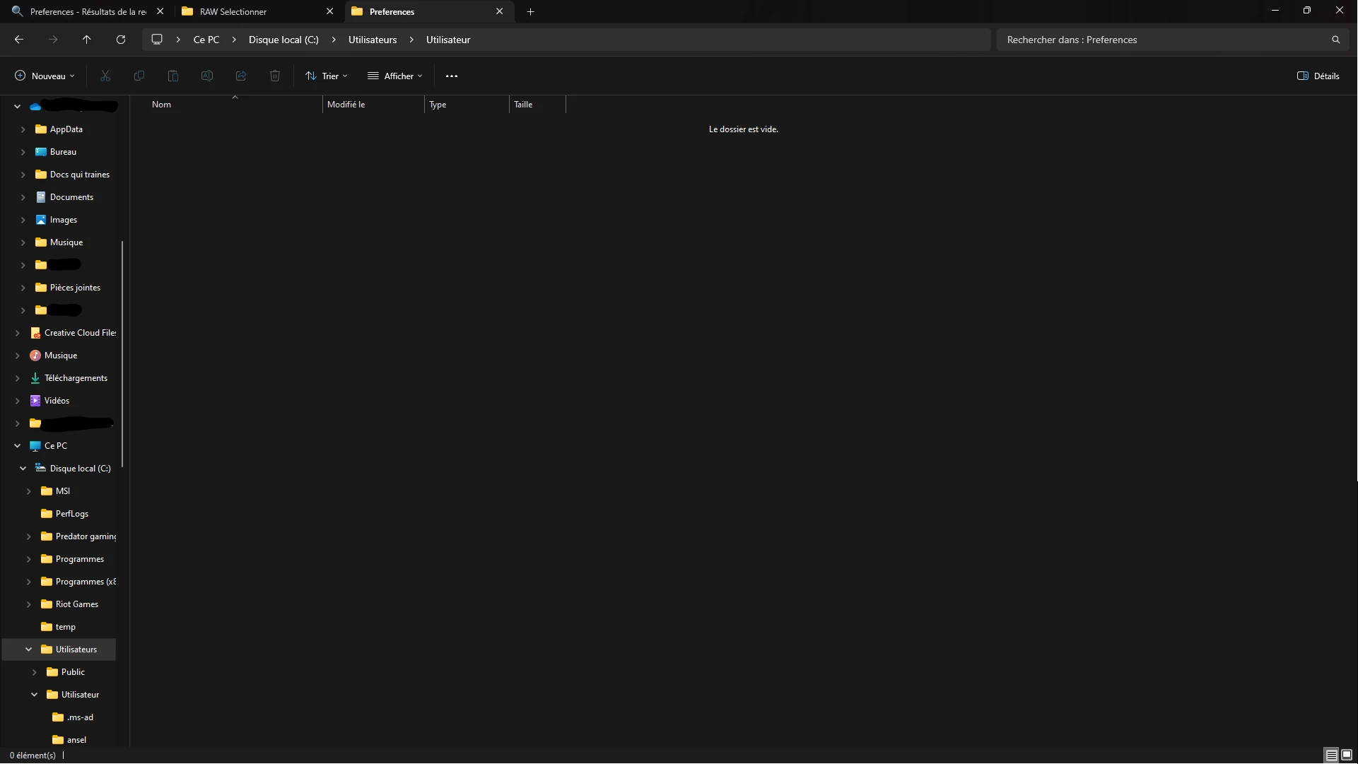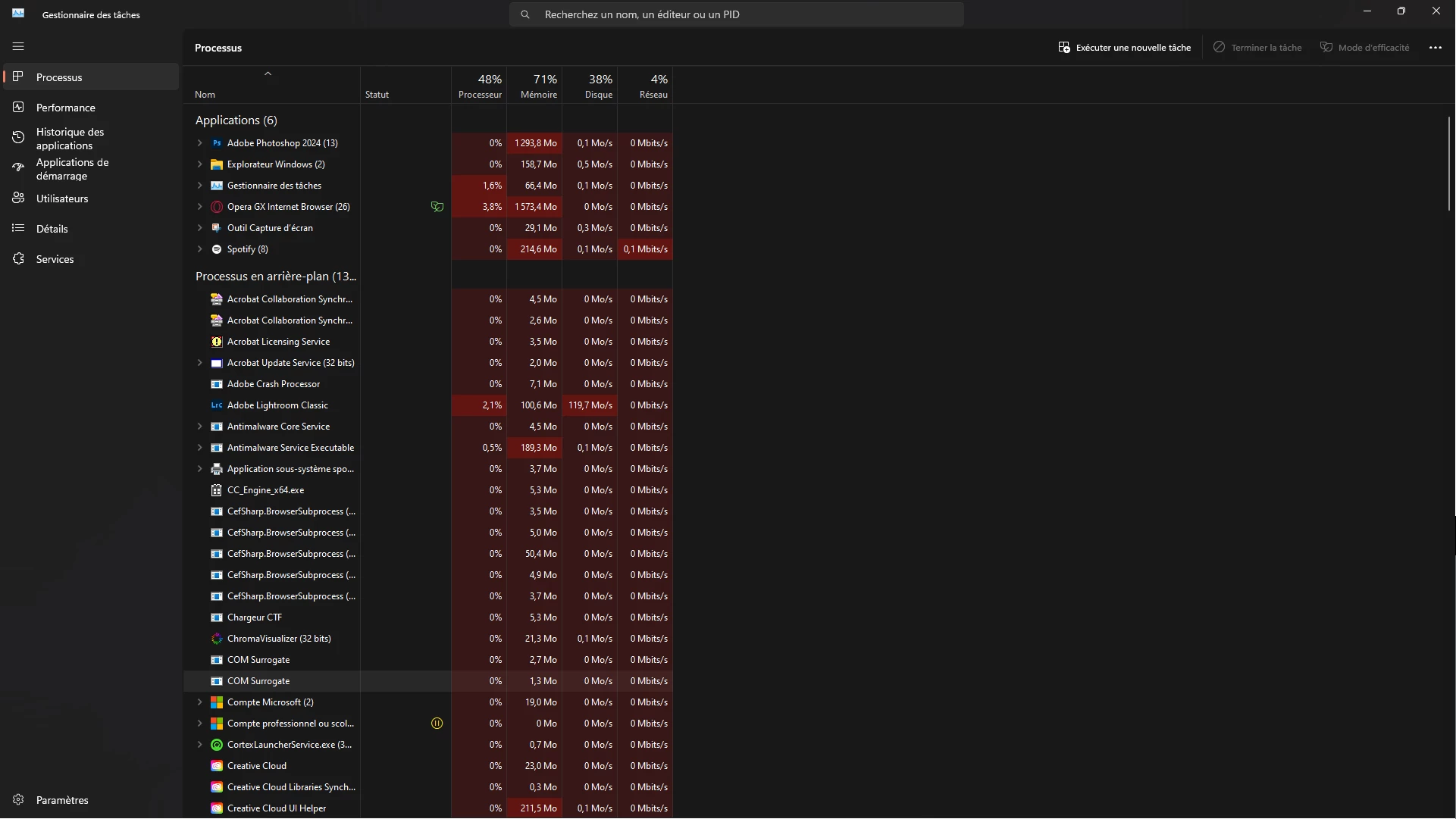 Depuis quelques semaines, j'ai rencontré un problème avec Lightroom Classic. Lorsque je clique sur l'application .exe dans l'explorateur de fichiers ou sur le launcher de Creative Cloud, je vois le curseur de la souris en mode chargement pendant quelques secondes, puis plus rien ne se passe. L'application apparaît dans le gestionnaire des tâches comme un "processus en arrière-plan". J'ai remarqué que les autres applications de Creative Cloud, telles que Photoshop, passent en "Applications" une fois lancées, après avoir été en "processus en arrière-plan". Cependant, ce n'est pas le cas de Lightroom Classic, qui reste bloqué en "processus en arrière-plan" (voir capture d'écran ci-jointe).