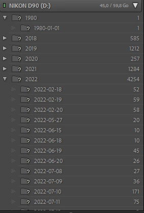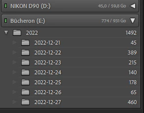 Normalement, toutes mes photos doivent apparaître dans le support "Bûcheron (E:)". Or, lightroom indique qu'elles sont rangées dans le support "NIKON D90 (D:)" alors que ce n'est pas le cas. Elles sont bien présentes sur mon disque dur "Bûcheron (E:)" et d'habitude, mes photos apparaissaient bien sur "Bûcheron (E:)" quand j'ouvrais le module bibliothèque.