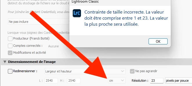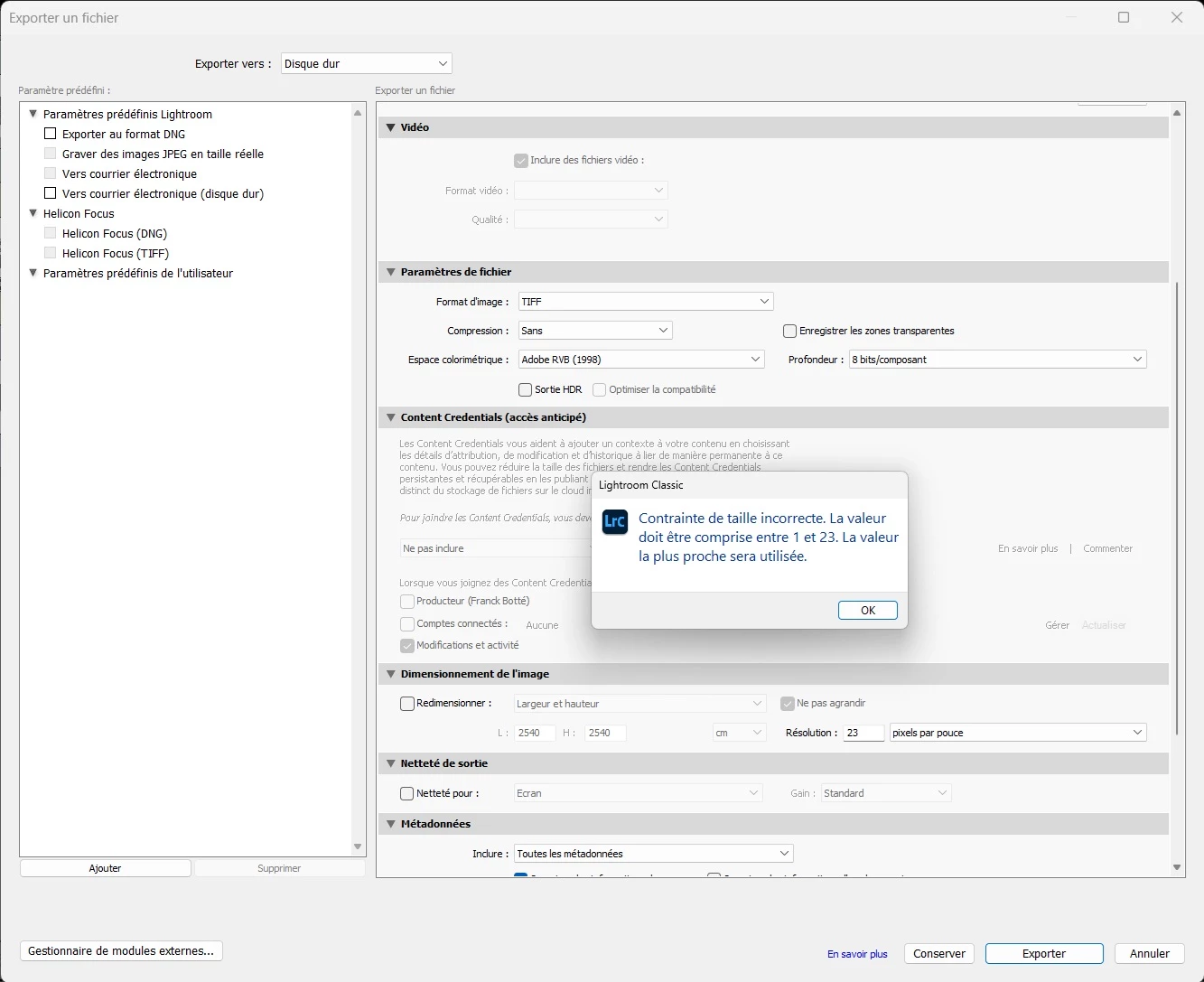 Depuis tout à l'heure, alors qu'habituellement mes exports en TIF se font en 300 ppp minimum, je ne peux plus appliquer de résolution supérieure à 23 ppp, ce qui est bien sûr insuffisant, un message indique :