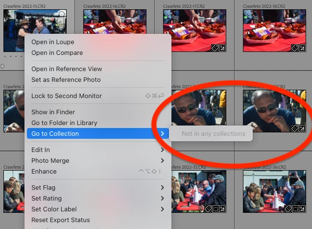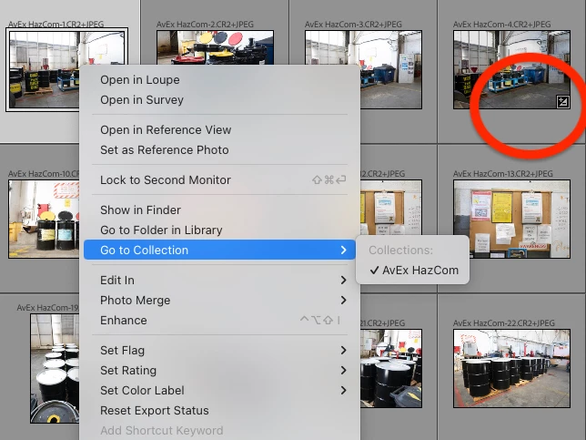 - Many photos also indicate via the right-click menu that they are not in a collection. However, the thumbnail badge shows it is in a collection.