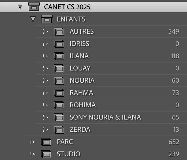 Je réalise donc plusieurs imports à la fois via la bibliothèque des différents dossiers sources en cochant à chaque fois “Ajouter à la collection” et en m’assurant bien que la collection cible est sélectionnée pour classer mes photos qui ont parfois le même nom (par exemple lorsque je donne des ateliers avec 10 nikon différents et où je derush par participant comme ci-dessus).