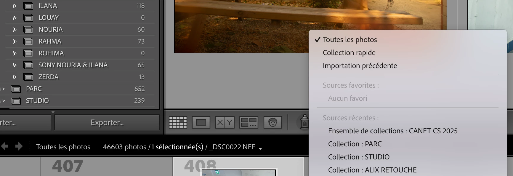 Je tente donc de les retrouver au sein du catalogue mais mes seules options de recherche sont “Toutes les photo” / "Collection rapide" / “Importation précédente”.