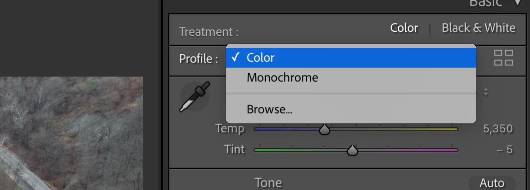 That threw me for a loop, but a little googling educated me: Adobe doesn't make "Adobe XXX" profiles for DJI cameras, so LR and Camera Raw use the profile that DJI embeds in the DNG (that's the "Color" profile). See the long discussion in this thread: