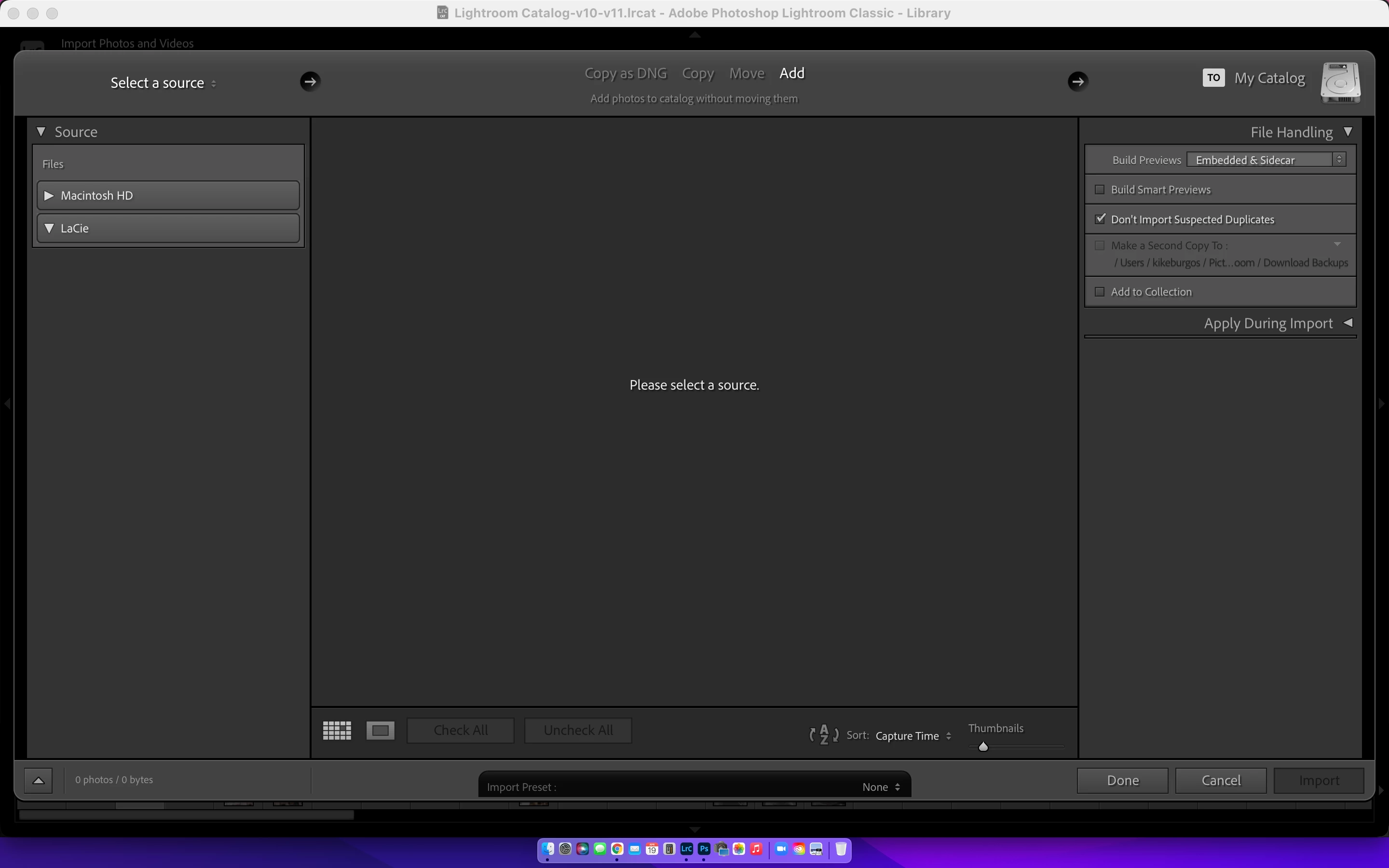 The Lightroom catalog cannot be used because the parent folder “/Volumes/Big LaCie/2022/JC 2022” does not allow files to be created within it.