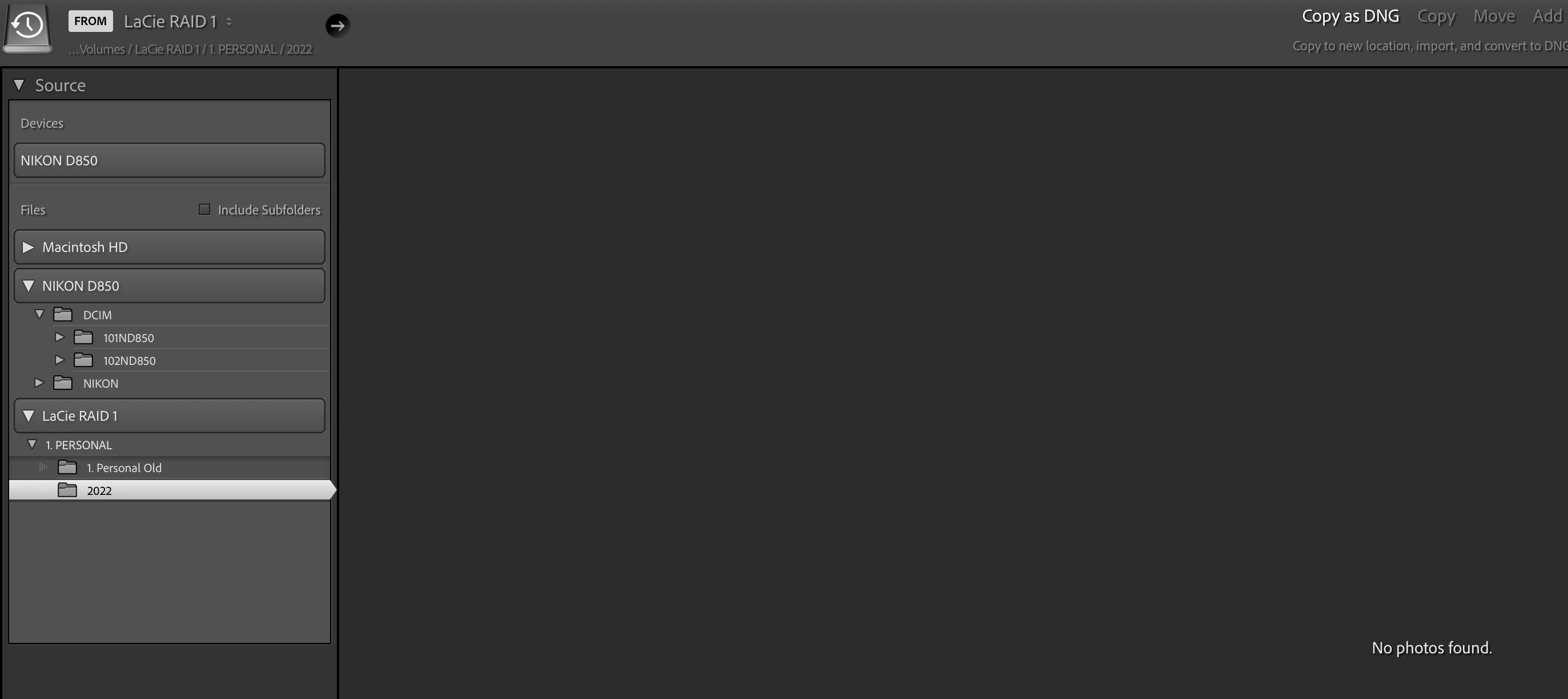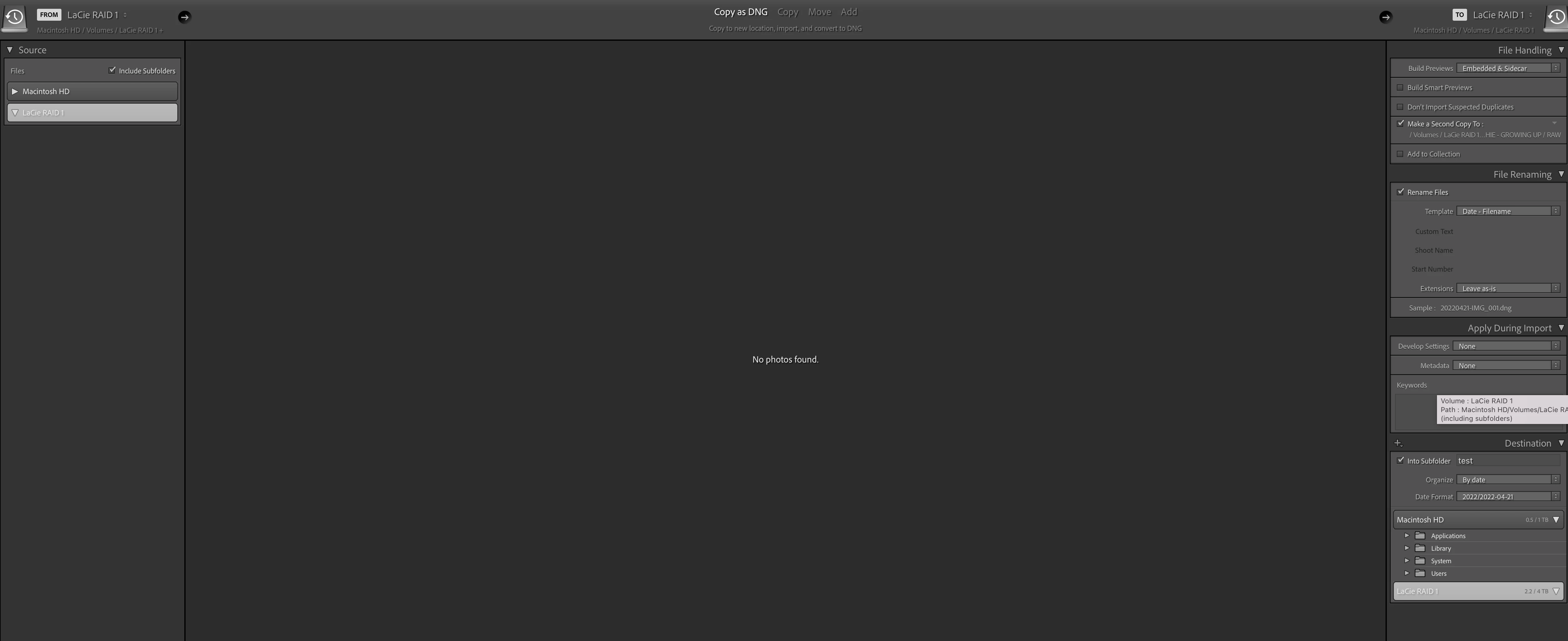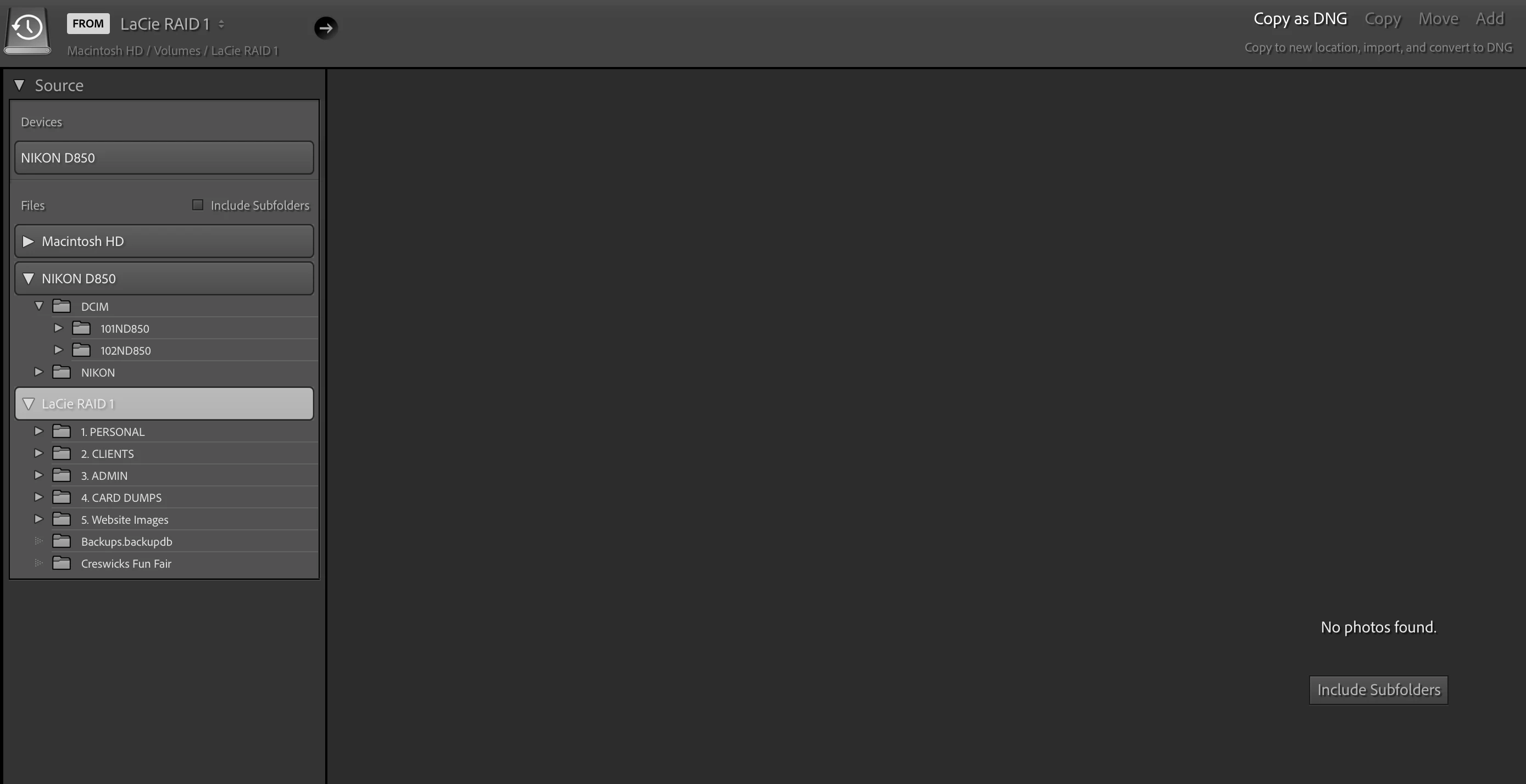 I have also just noticed that in the import screen it usually defaults to Copy as DNG but today it wants to default to "Add"? When I click "Copy as DNG" I also notice that all my folders (under "Destination" under the external hard drive (LaCie RAID 1)) are no longer showing (or when they do show it no longer recognises the previous folders? And the other thing that I have noticed is that the "include Subfolders" (under Source) seems to uncheck by default...