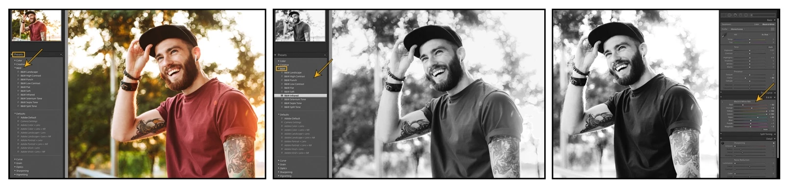 Use presets to convert color photos to black and white