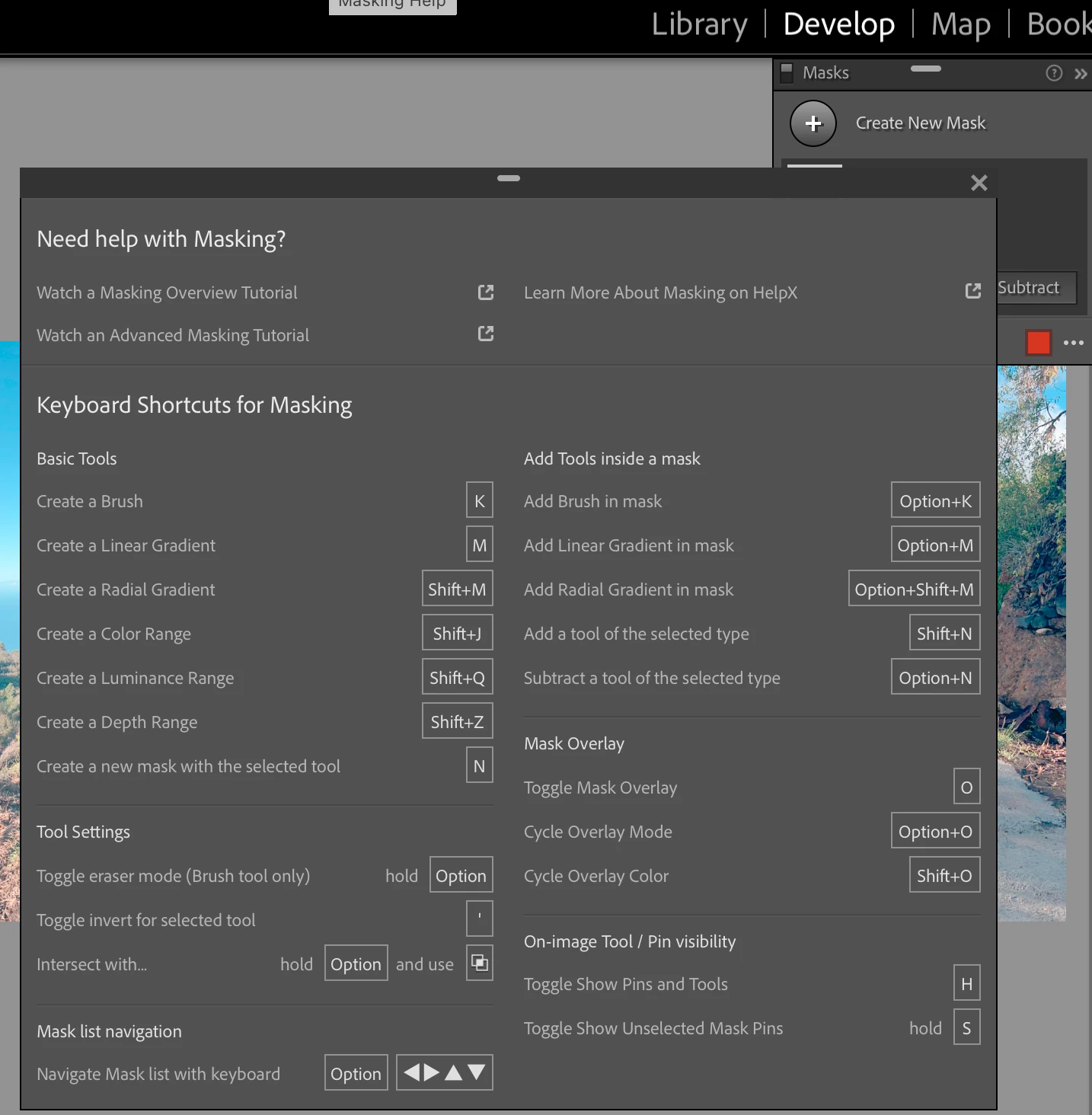 If you click the tiny (?) in the circle in the top of the mask panel, it brings up a list of available shortcuts. The KBSC you are looking for is about 4/5 of the way down the left column.