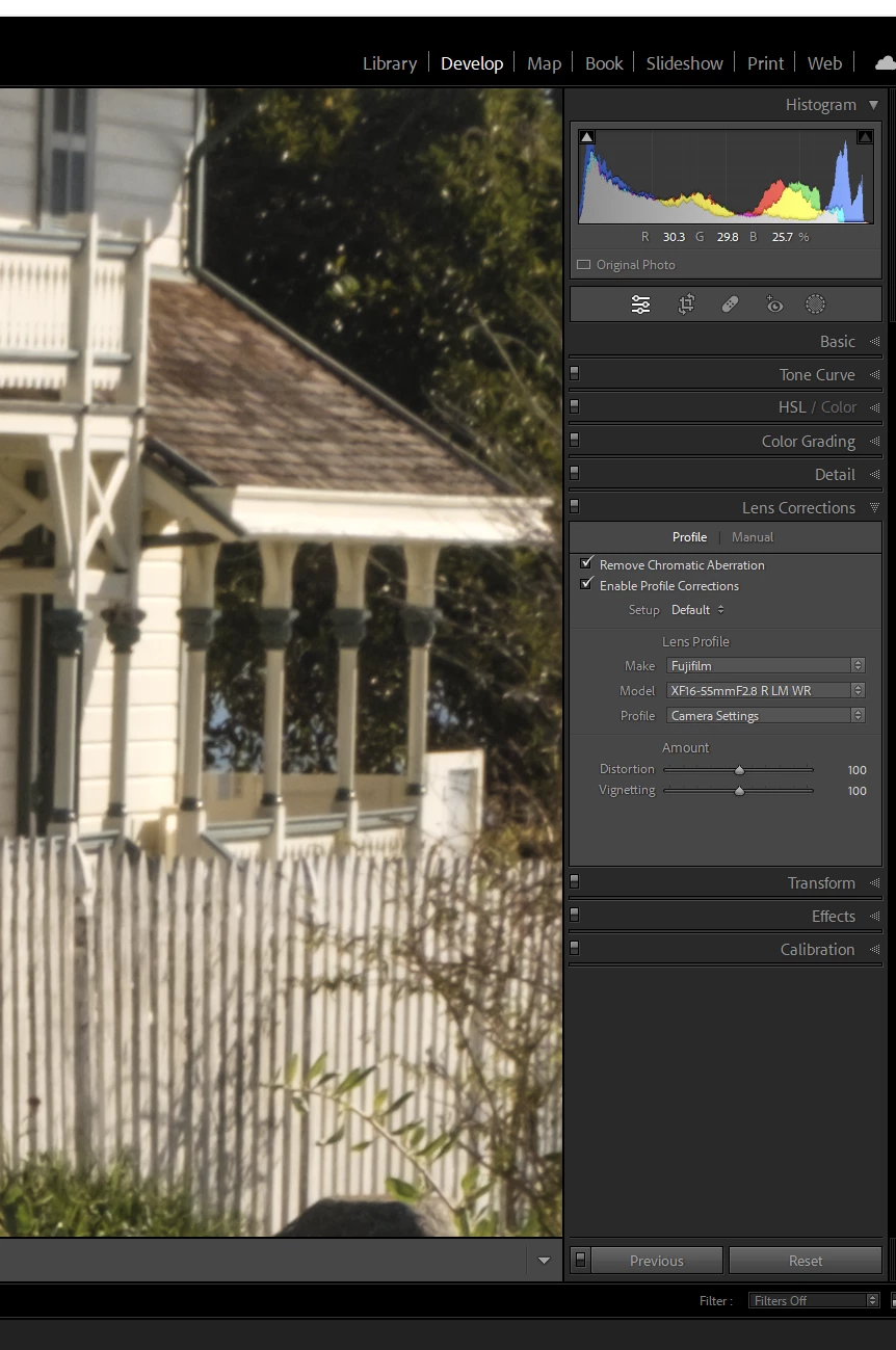 RAF from Fujifilm X-T5 not loading built-in lens profile (distortion/vignette) until zoomed to 100%