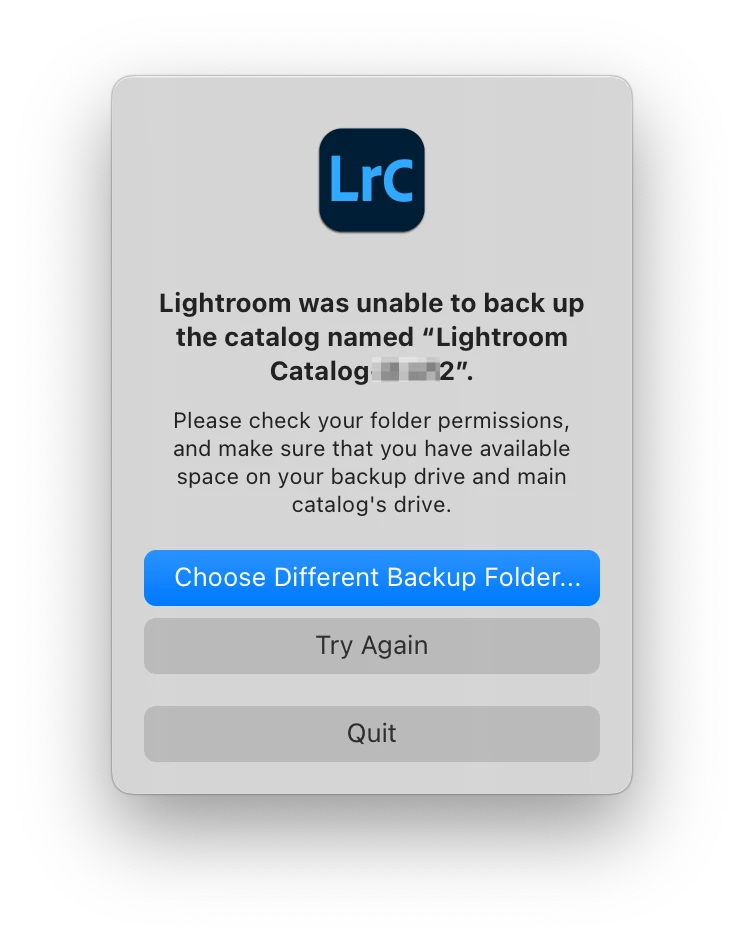 The problem originaly came about when I updated from 12.0 to 12.1 (December 2022). Suddenly LrC would no longer back up to any external drive. Could change the backup location to my primary internal drive and had no issues. This had never been a problem before v12.1.