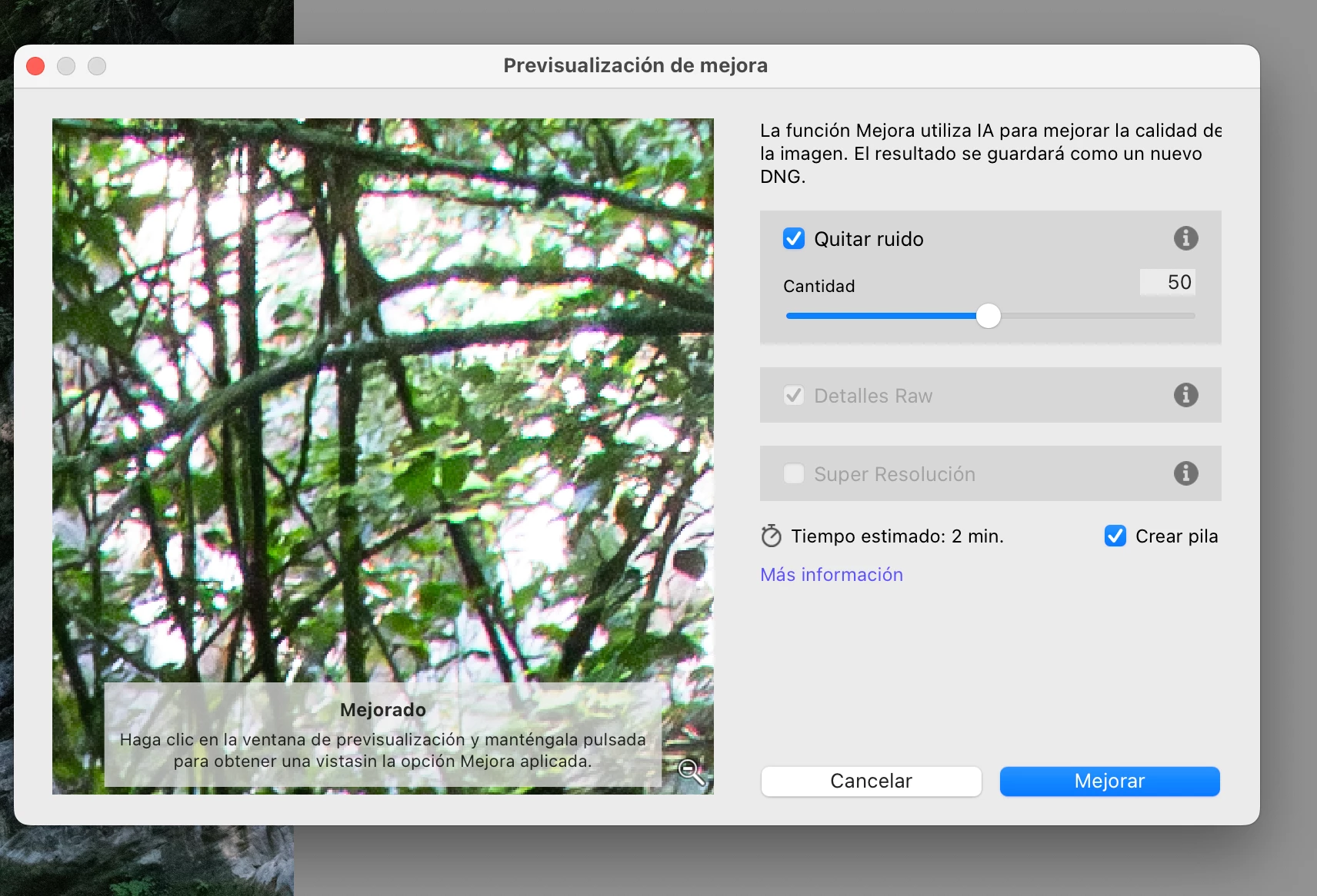 Reducción de ruido AI no genera el archivo mejorado