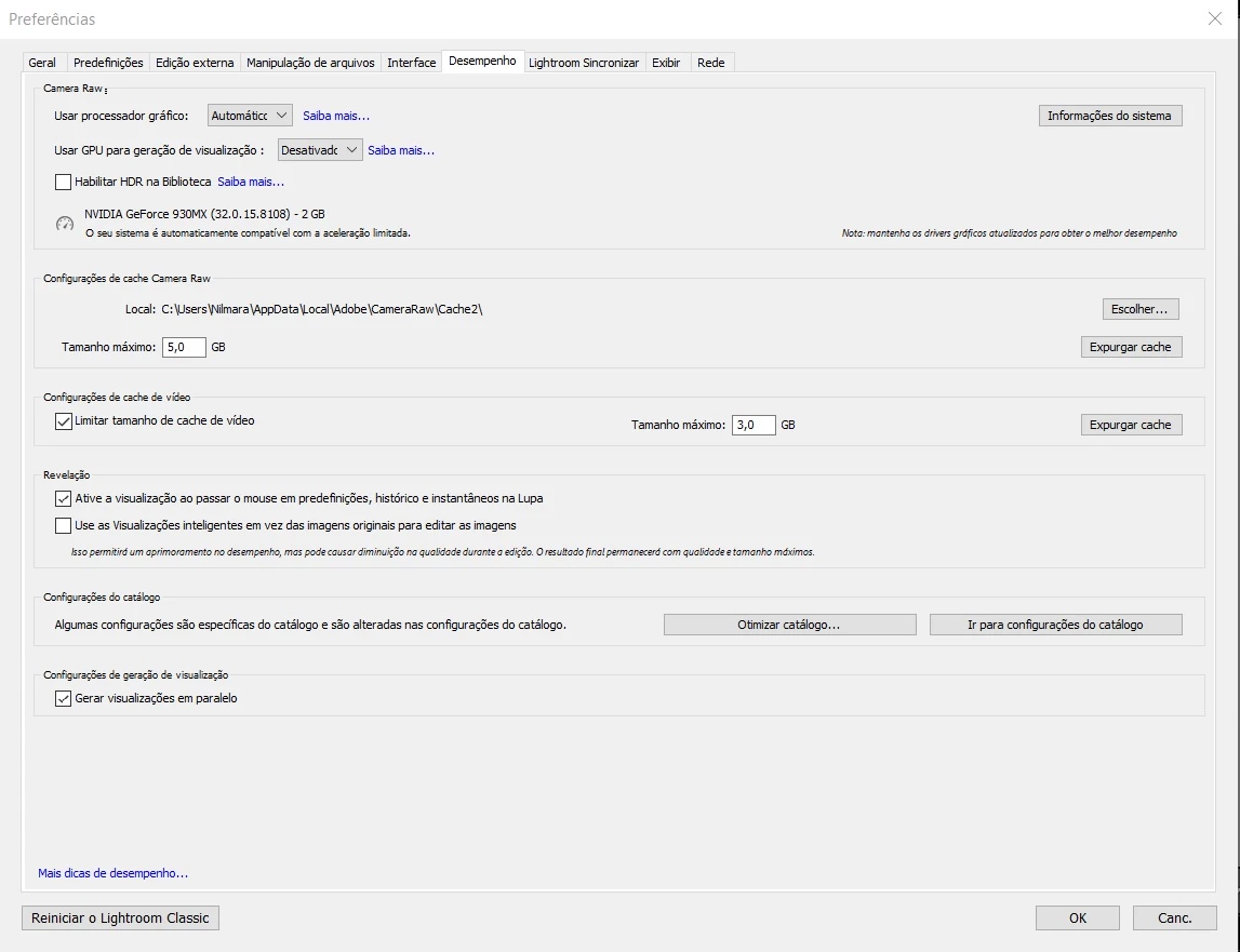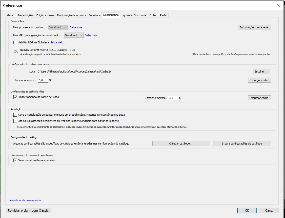 Na guia Editar > Preferências> Desempenho. Aparece a seguinte mensagem: A aceleração de gráficos está desativada devido a um erro.
