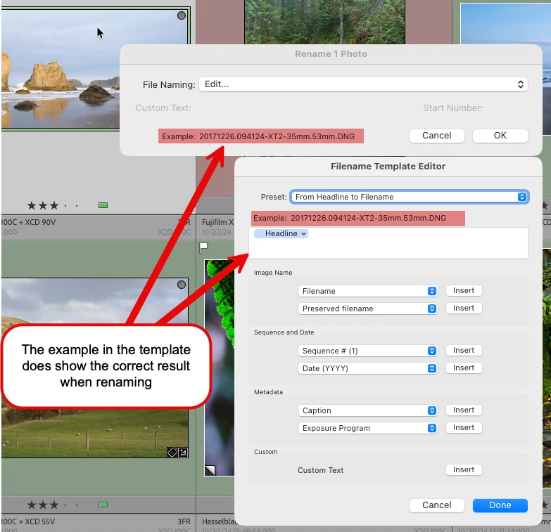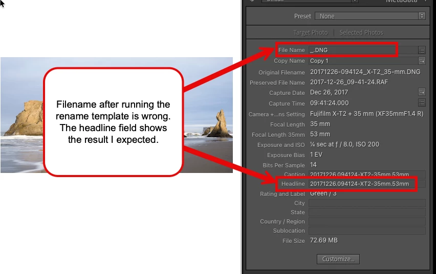 I have a custom Filename Template that reads data from a Metadata field (I normally use the Headline field) which is pre-populated with my desired final filename. When I open the custom template in the Rename Photo utility, I see the example filename displayed. This information text shows the desired, correct final filename. But when I apply the rename, the filename is instead replaced with an underscore character “_” then a period and the file extension.