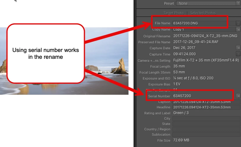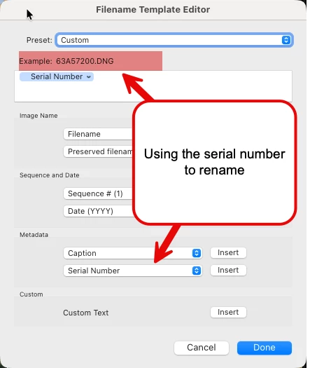 If however, I change the Renaming template to use a non-writeable field such as serial number, the rename is performed correctly. See the final screenshot for that.