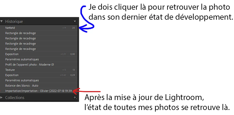 Depuis quelques versions (je ne sais malheureusement pas laquelle), à chaque mise à jour de Lightroom Classic, toutes les photos de mon catalogue "retournent" au premier élément de l'historique de développement, c'est-à dire à l'état originale de la photo importée. L'historique des modifications n'est pas perdu, mais je dois cliquer sur le dernier éléments de l'historique (l'élément le plus haut dans la liste) pour retrouver la photo dans son dernier état de développement. Et je dois faire ça pour chacune de mes photos... Dans un catalogue de plus de 50 000 images.