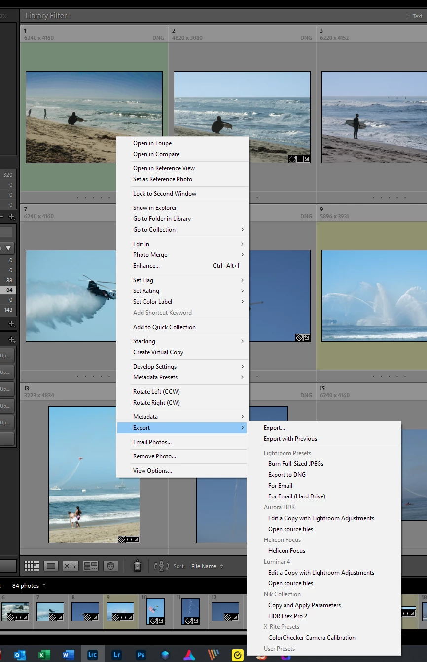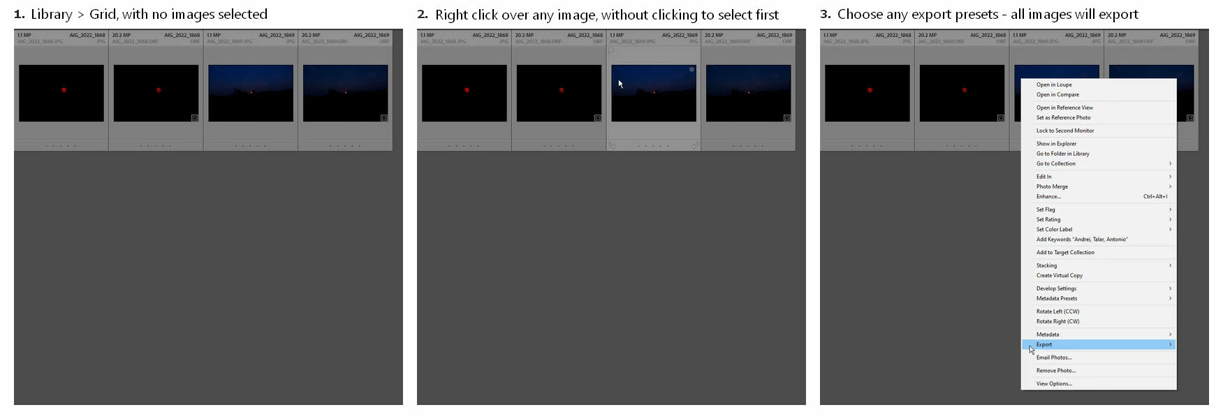 Right clicking and Exporting with no images selected exports all images in the grid.