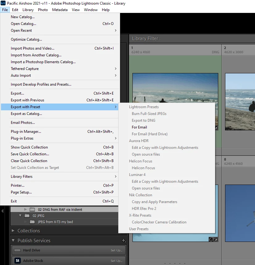 When in Library > Grid view, if you do NOT have an image selected and you right click ANY image (without left clicking to select it) and choose an Export preset, it will export ALL the images in that grid view, and not just the image over which you right clicked.