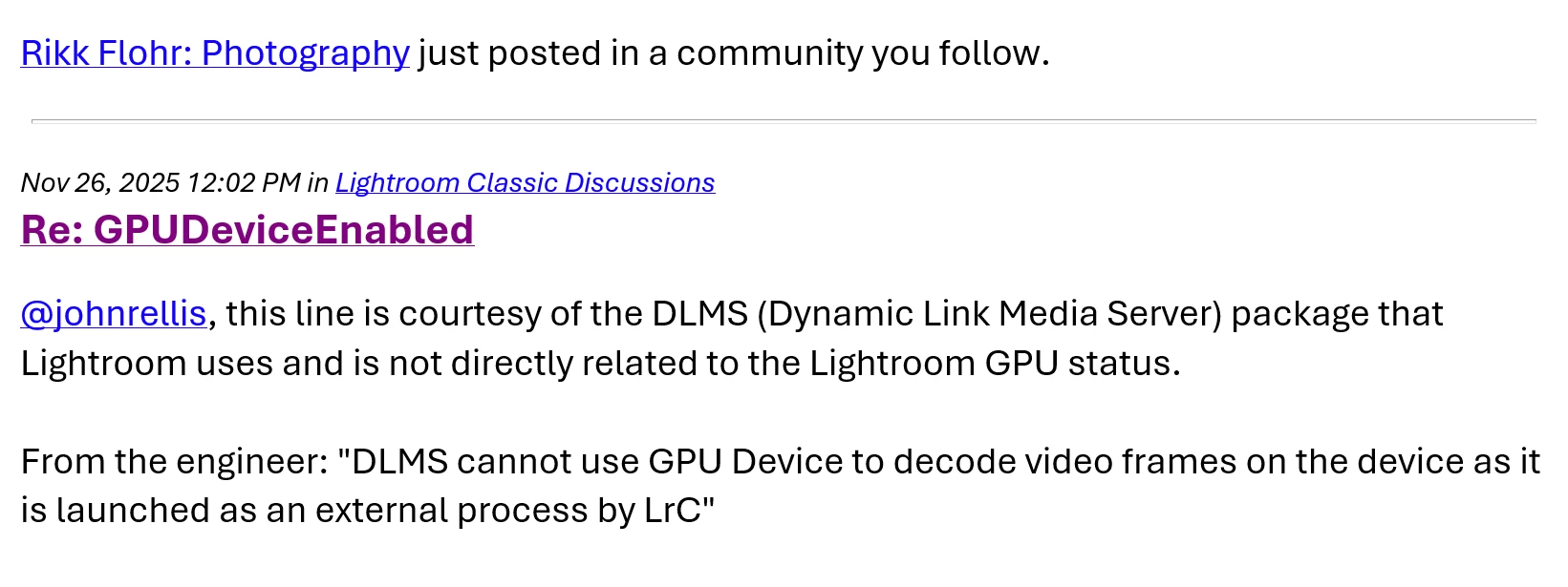 - "GPUDeviceEnabled: false" — full GPU image processing is NOT enabled