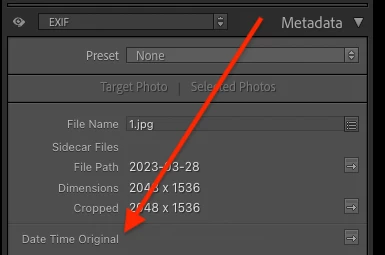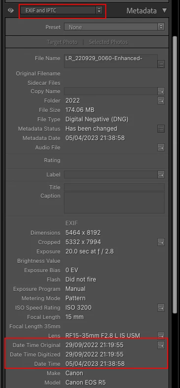 Please provide a screenshot of Ligtroom 'EXIF and IPTC' metadata panel (see attached scresenshot) showing the date and time. A screenshot of the 'Default' metadata panel would also be useful.