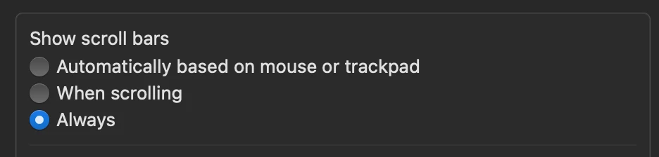 I have set scrollers to always appear in the Mac settings.