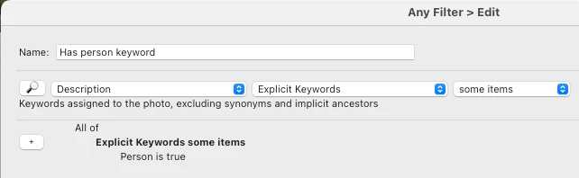 I have over 60K images. I want to create a selection for export that includes only people which are already tagged. This would exclude any landscapes or people I have not tagged. Is there an easy way to do this.