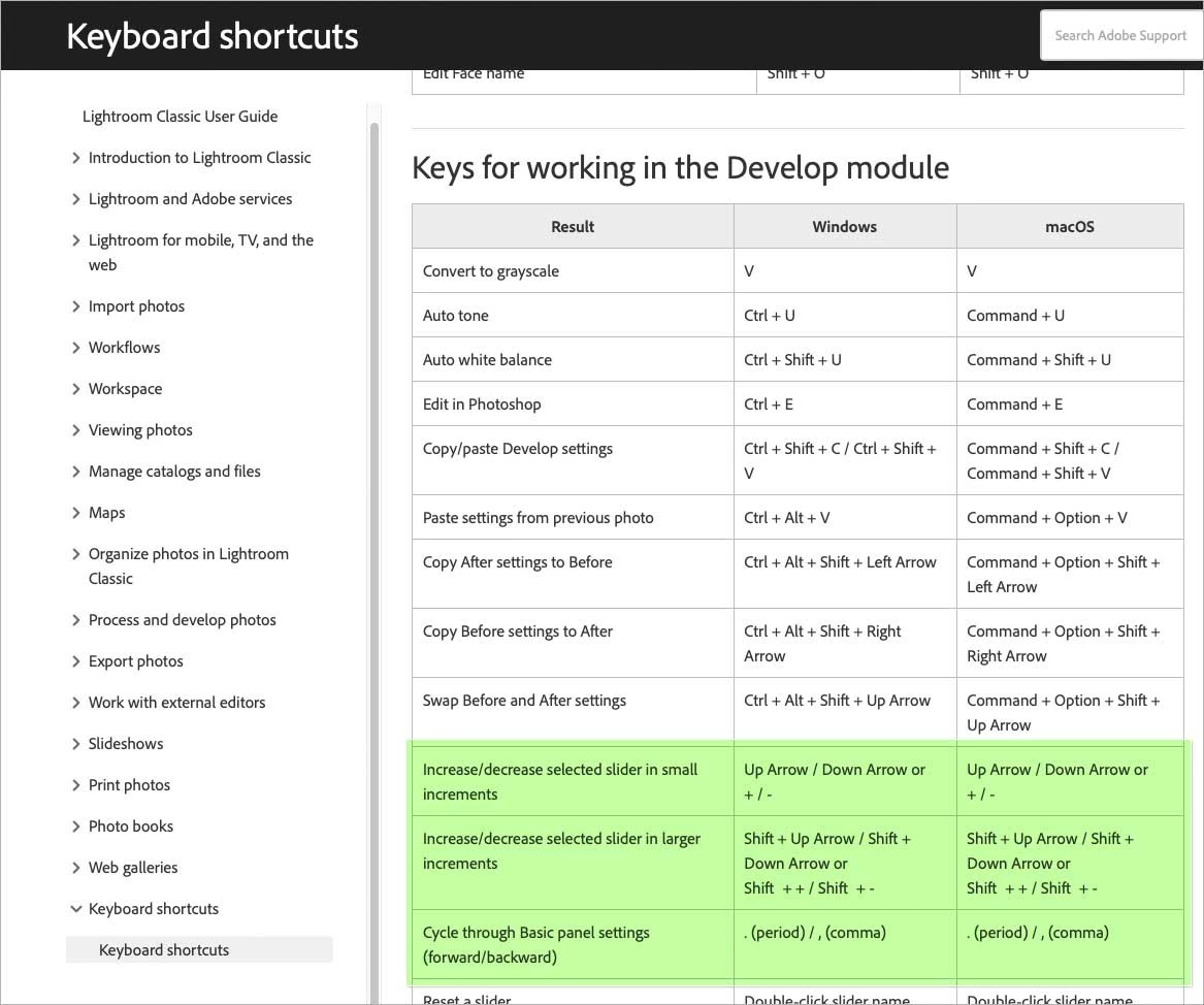 As for where this is documented, it’s pretty obscure, so definitely not easy to find by searching. The only reason I could find it is because I already knew how the shortcuts worked. These are listed on the Adobe Help web page Keyboard Shortcuts, under the section Keys for Working in the Develop Module.