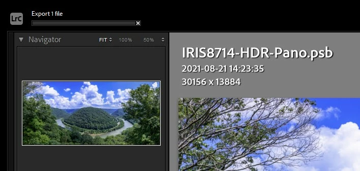 I never had a problem exporting large panoramas before. This image is 30,156 x 13,884. It will not export from Lightroom Classic. Normally if something like this would happen, a quick reboot and we would be off to the races. Rebooting did not seem to have any effect. It just sits at "Export 1 file" forever.