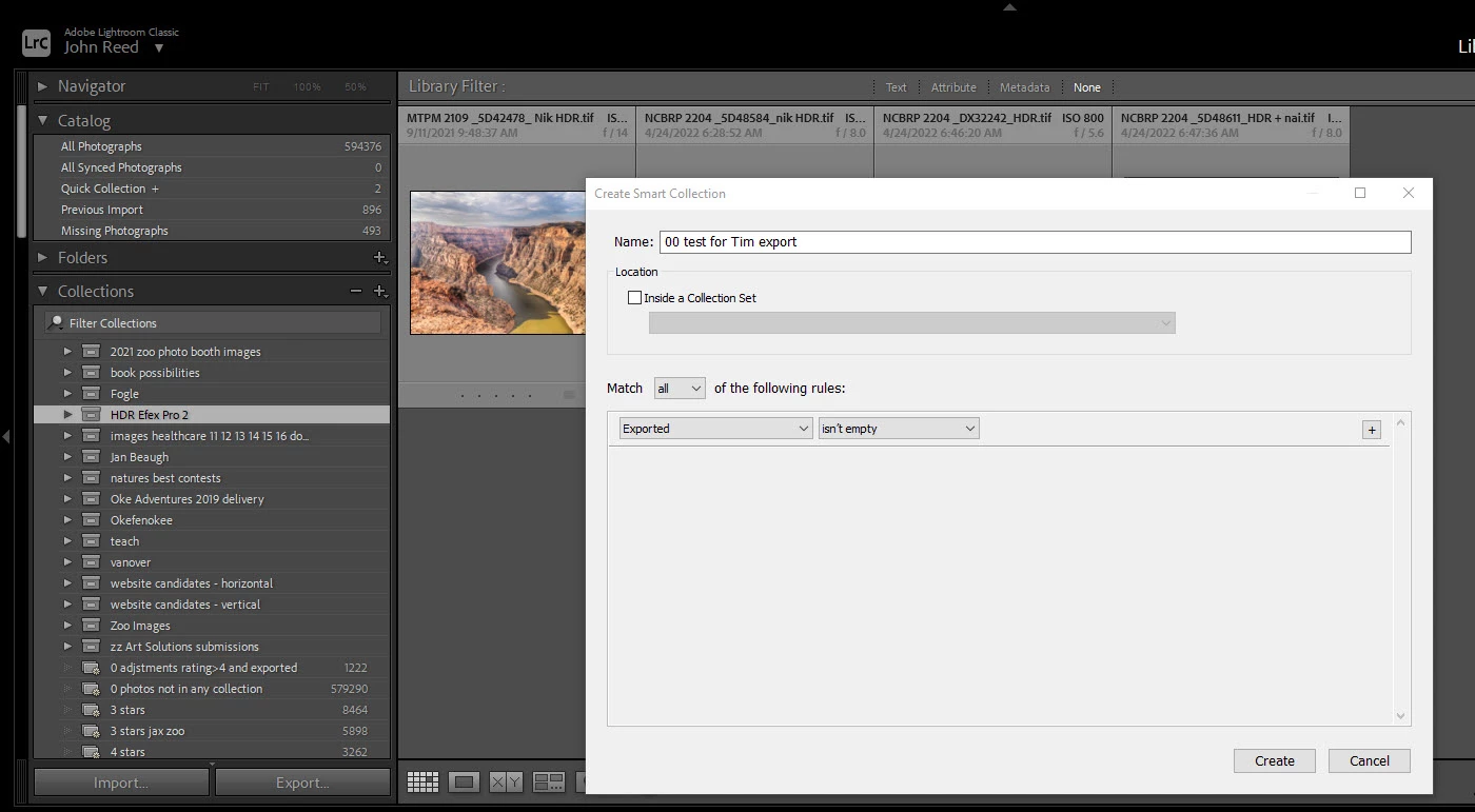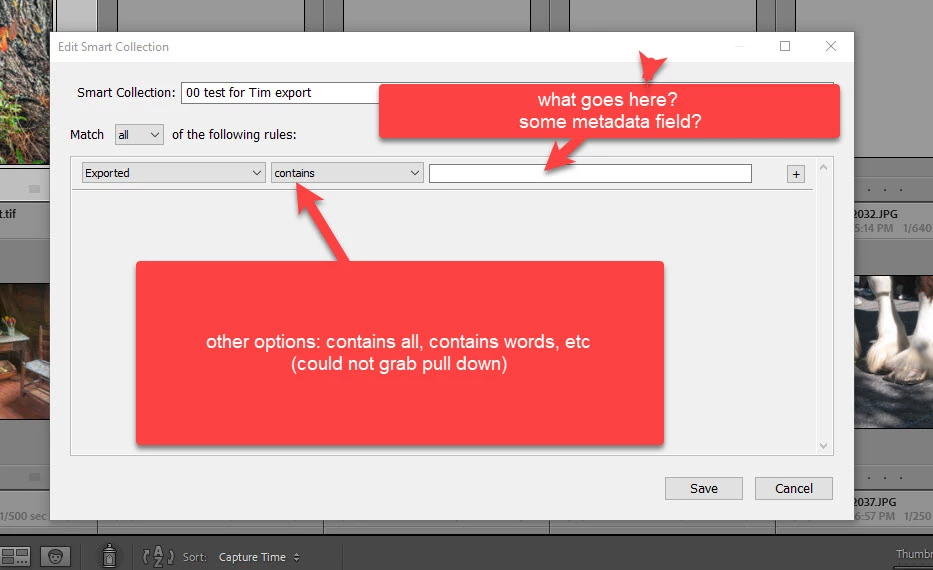 regarding smart collections, what in the heck goes into the box when the export option is selected as shown in the screenshot? I also tried selection "starts with" and am confused over what it's looking to start with. I tried filename, dates, other things and always the result was an empty collection. I can find NO documentation on this.