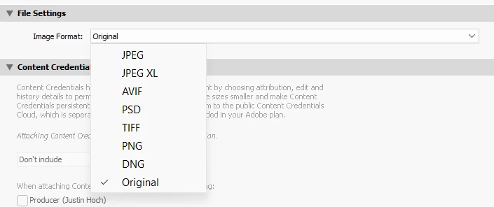 2) The other way would be the Export, as you're saying. You should be able to export them to one common folder using the export dialogue, and that would be your best bet, I think. Using the Original setting for Image Format in the File Settings section will strictly make a copy, with no adjustments you might have made to the files in Lightroom. You might not have made any anyway, if you're only using it to organize. But if you did make edits you want to keep, and you don't want to change the file exptensions, then I would filter by file type in the Grid view first, export all the JPGs, for example, using whatever export settings you'd like, then repeat the process for the HEIC files. That will allow you to keep their original file formats, apply whatever edits you've made, and have updated copies in the new folder. Or you could just export all of them to one common file format - it wouldn't have to be JPG, as you can select various options in the same Image Format dropdown and keep the edits that way, too.