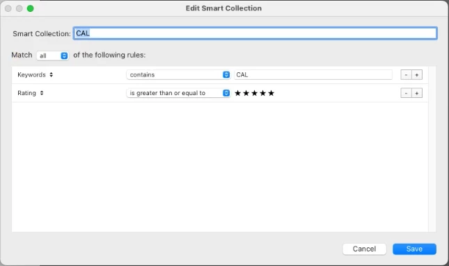 I have a series of smart collections set up to collect the best images from each tour - each collection is set to gather all the images with a given tour code ("CAL") and which are 5* rated. I've attached a screenshot of the smart collection settings. My understanding is that, with the keyword setting set to "contains", the smart collection should gather all images which have a keyword starting with "CAL". However, it seems to be gathering a lot of other images to. As a representative sample, the second screenshot shows the keyword tags associated with another image which is being included in this smart collection. I'm not sure what I'm doing wrong. If I set the rule in the smart collection to "contains words", it does reduce the number of images in the smart collection, but I'm worried its missing some out, and because of the size of the library, it's not practical to check manually.
