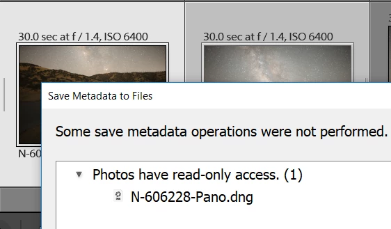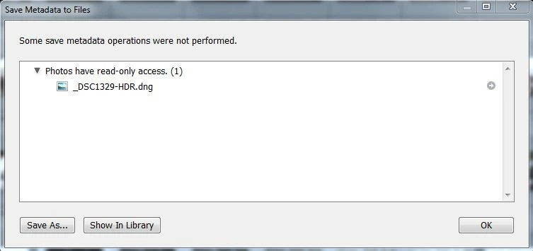 Please see attached image. I've been getting this 'error' pop-up for a couple days which seemed to come out of nowhere. I'm only seeing this on DNG files created using Photomerge to HDR. The error appears at the moment Lr is importing the new DNG. Where to start?