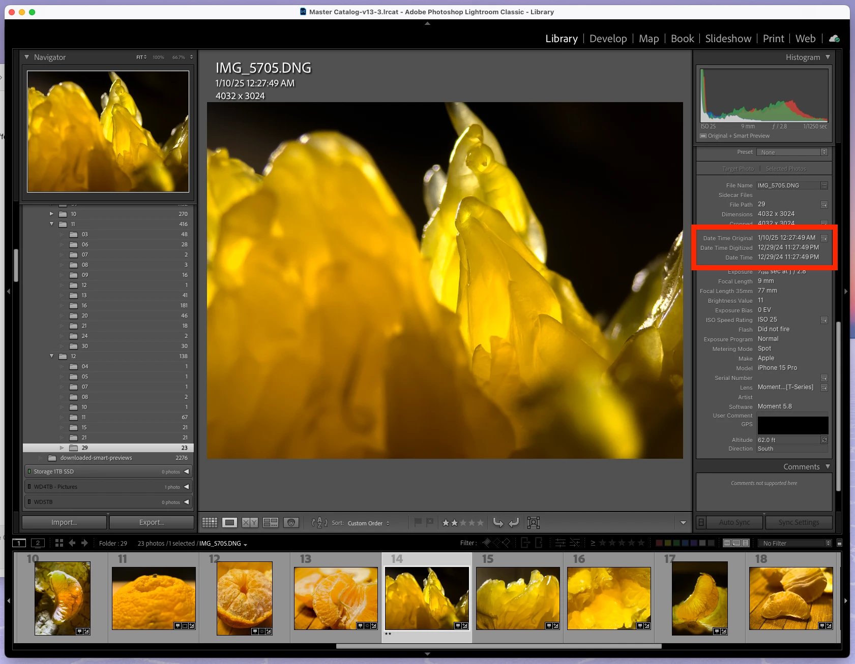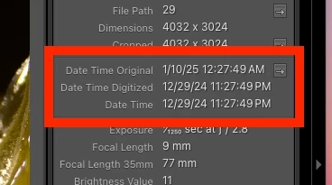 This is a weird one, so apologies in advance for the lengthy post. I noticed that some of my photos aren't sorting correctly by capture date in Lightroom/Lightroom Classic. As background, I'm using Lightroom Mobile on iPhone/iPad, and Lightroom + Lightroom Classic on a Mac laptop. As one example, I took a bunch of pictures on Dec. 29th around 11pm on my iPhone with the Moment Pro Camera app. I imported these into Lightroom Mobile, and edited them in the Lightroom app on my laptop. Looking at these images' full EXIF data in LRC, the Date Time Original property says I took them on Jan. 10th, 2025 - which, as I'm typing this, is six days from now. Date Time and Date Time Digitized say the correct date of Dec. 29th. According to ChatGPT, the offset is exactly 13 days and 8 hours apart, which is totally meaningless to me.