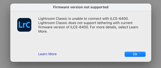 Hello, I have updated Lightroom to version 14.2 where you say that it already supports the Sony a6400 when tethering. But when connecting LR it says that this firmware is not supported, even though it is the latest version 2.0.