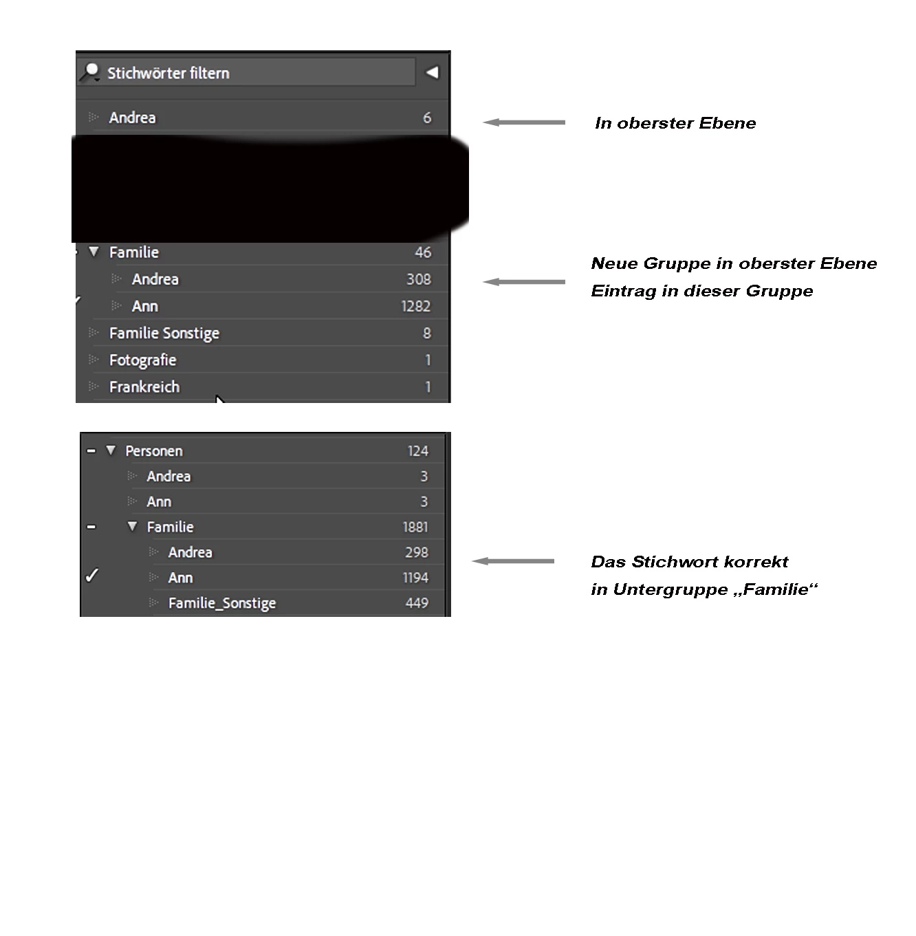 Ich habe eine Gruppe "Familie" erstellt, in der verschiedene Namen als Gruppe der nächsten Ebene von mir angelegt wurden. Dann erscheint an anderer Stelle entweder noch einmal unter der obersten Ebene die Gruppe "Familie" mit einer Untergruppe mit einem Namen und einer geringen Anzahl von Bildern, die ich dort nie hinzugefügt habe.
