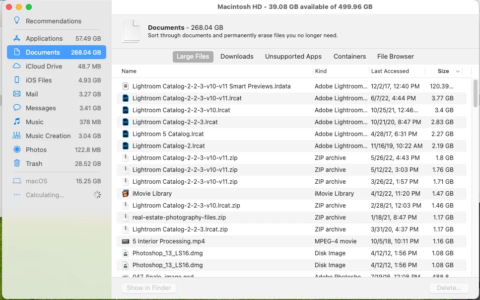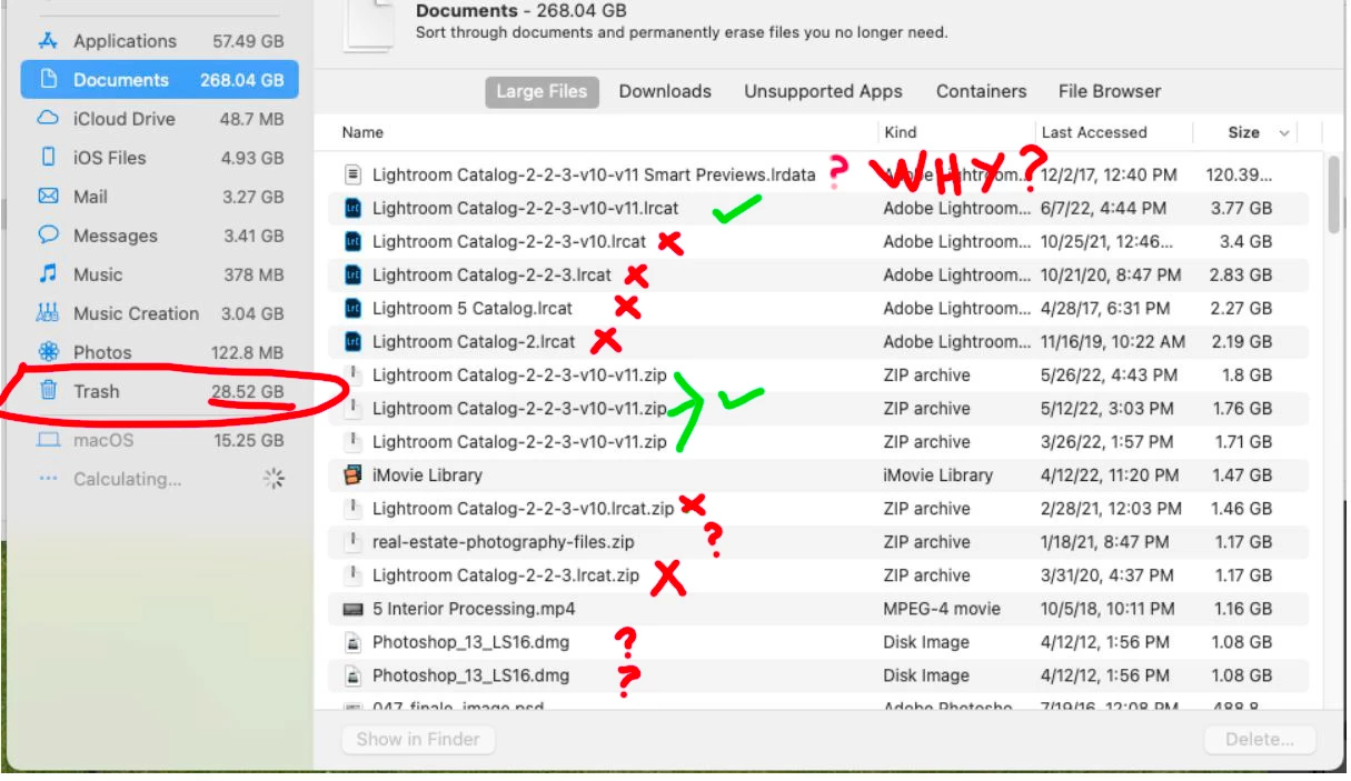 I am a regular Lightroom user but I am far from expert on how the software works. I have manged to nearly fill up the storage space on my hard drive and it seems the major culprits for space usage are related to Lightroom. I am affraid to delete or move anything because I do not want to disrupt anything. Below is a screen shot of some of what I have stored o my hard drive that is lightroom related. Any suggestion as to what I can delete or migrate safely. Thanks very much.