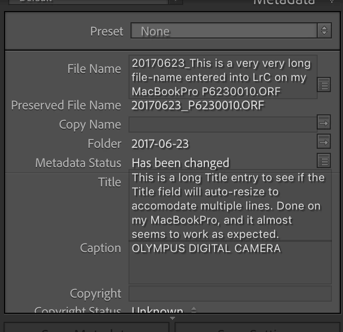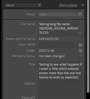 Currently in the latest version of Lightroom Classic (and all earlier versions) the fields for seeing and editing the File Name and Title are hard fixed at one line of around 30 characters. This is crazy with modern operating systems that allow for loooonnnggg file names, and for people who use long Titles. Can Adobe please allow for the entry fields to be bigger or auto adjustable in size. By comparison, the fixed Keyword Tags displayed content is massive, and the Caption field auto resizes to suit content - which is precisely what File Name and Title should do as well. Thank you. If no Adobe person will ever see this, where do I submit corrections for bad interface design?