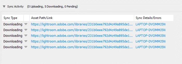 Hello all. I am moving from LR cloud to LR classic. I have synced LR classic but get the same 5 files saying they are downloading. I have tried rebooting etc and used the 'rebuild sync data' in LR but the files are still there. I do not recognise the Laptop reference but it looks like a laptop name. Any help resolving this greatly appreciated. Thank you!