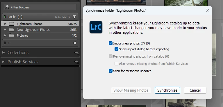 Once I've relocated all of the folders, I try to synchronize one of the top level folders on F: and it finds about 7,000 missing unimported photos. If I hit import it imports WAY more than 7,000, including photos on the C: drive (I stopped it at about 30,00). Same happens if I go to the folder and choose Add in the import dialog box.