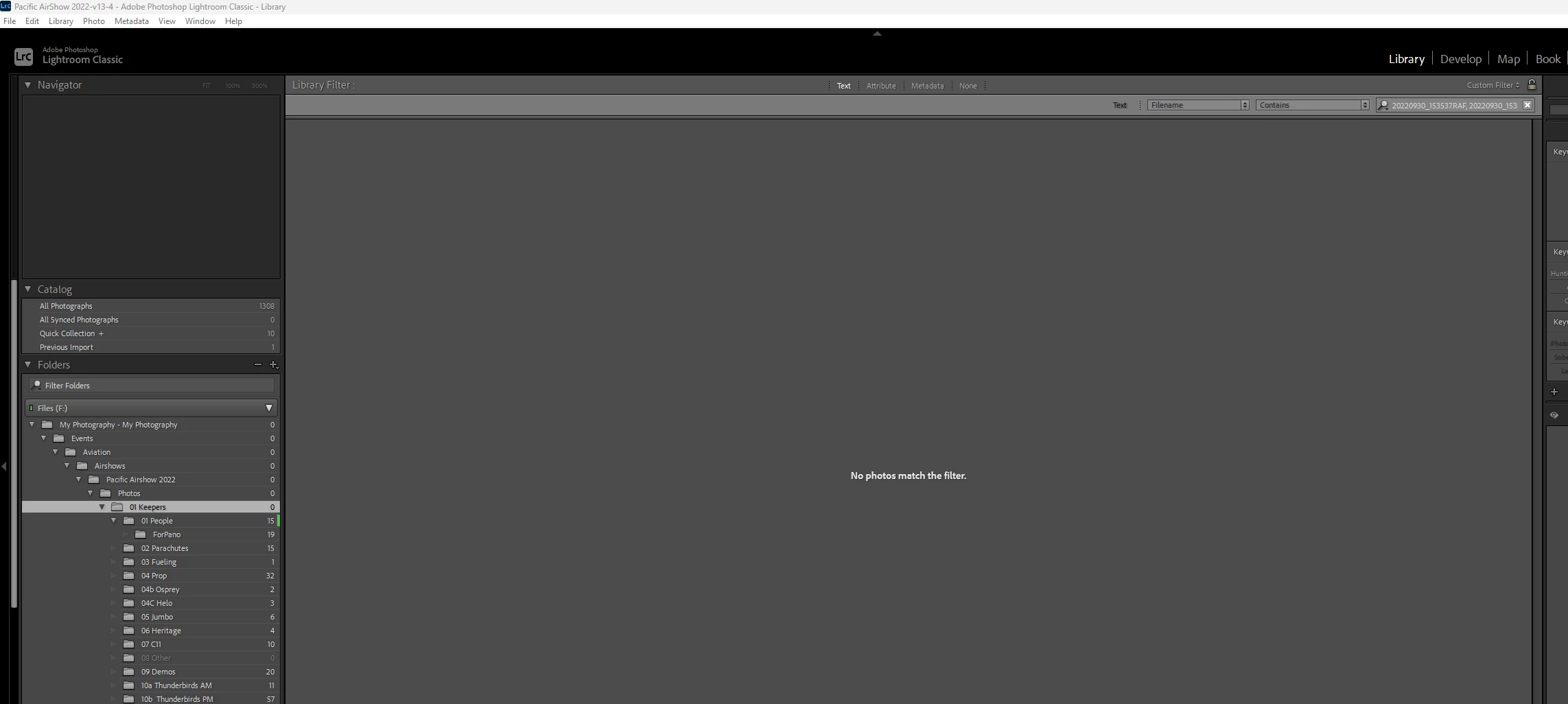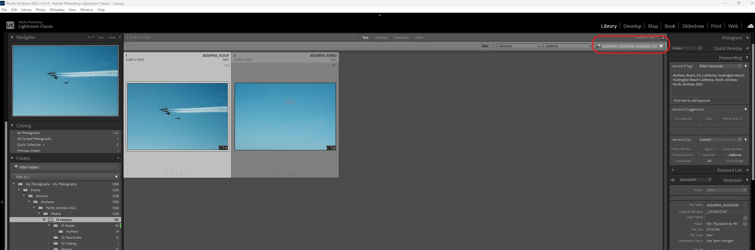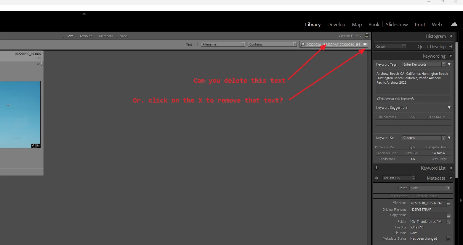 Not only is lightroom not able to pull these images (it appears to just disconnect from entire catalog database) but the text field is automatically filled with the same list every time I try to use the text search field.