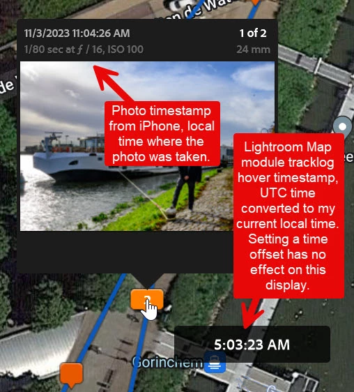 - The Lightroom BUG is that "Track Time Offset" has no effect over the timestamp displayed when I hover over the tracklog.