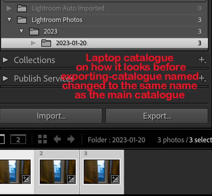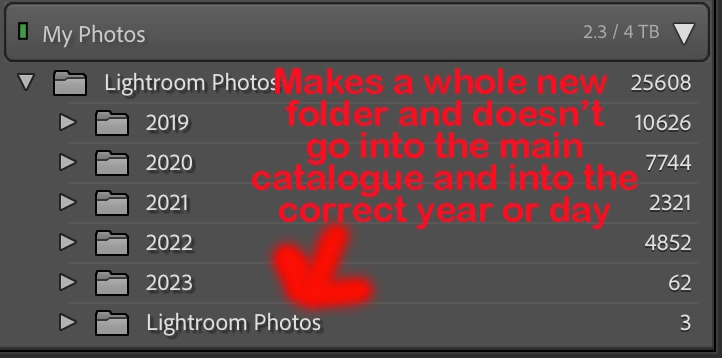 I used to be able to import images into the catalogue on my laptop, process them then I export the folder as a catalogue. I would take that catalogue and import it into my main catalogue. It would automatically get put into the catalogue sorted by date etc. Now when I do it it gets put into the catalogue but it is named by the catalogue name from the first catalogue (the one on my laptop) then the year and then the day. I tried changing the catalogue name to the same name as the one in my main catalogue. Still it is happening.