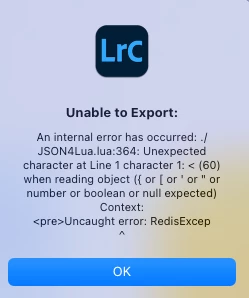 The error message is: "Unable to Export: An internal error has occurred: ./ JSON4Lua.lua:364: Unexpected character at Line 1 character 1: < (60) when reading object (for [or 'or " or number or boolean or null expected) Context: <pre> Uncaught error: RedisExcep"