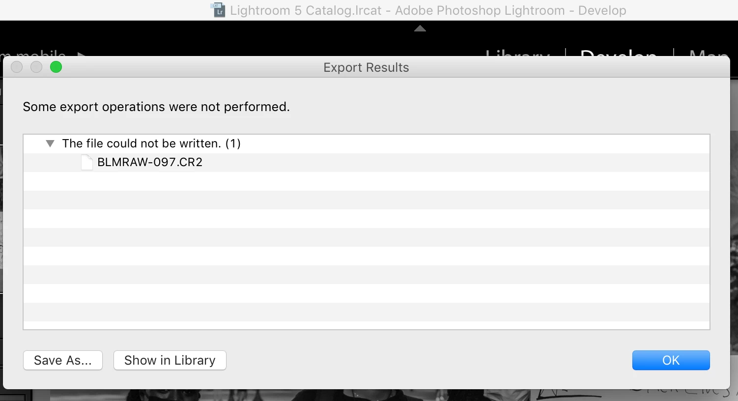 I use Lightroom almost daily, and out of nowhere when I try to export any images to save to desktop (or thumb drive) I get a message that says "some export operations were not performed" at heading, and "the file could not be written" in the body of message. I've installed updates, cleared room on hard drive, etc. Please advise. I've got deadlines!!