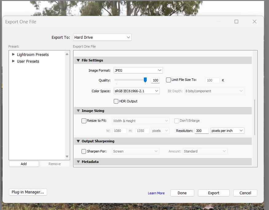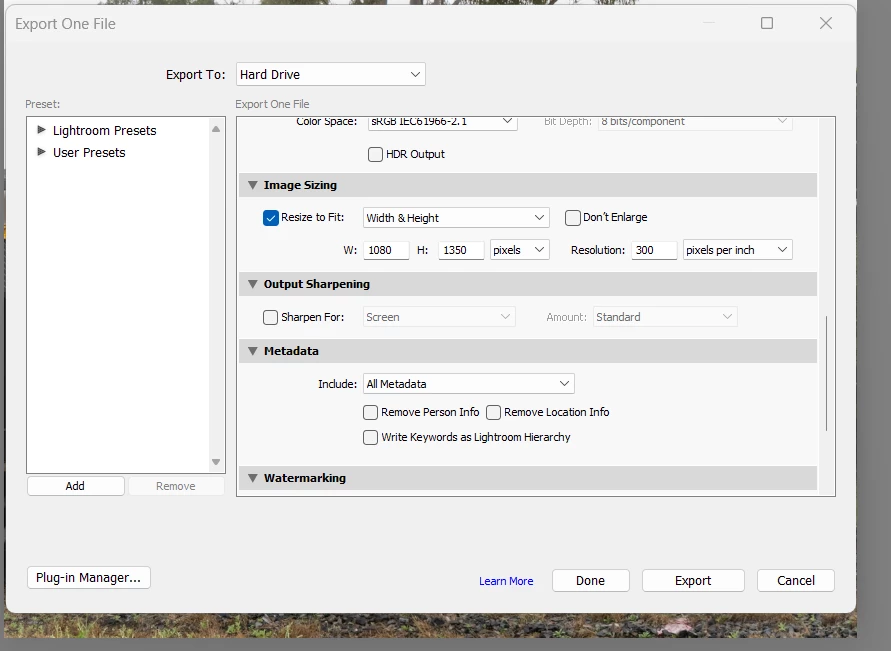 Despite these steps, Lightroom consistently exports the image at 1080 x 864 pixels, which does not match the intended 4:5 aspect ratio. This discrepancy is significant because it disrupts my workflow.
