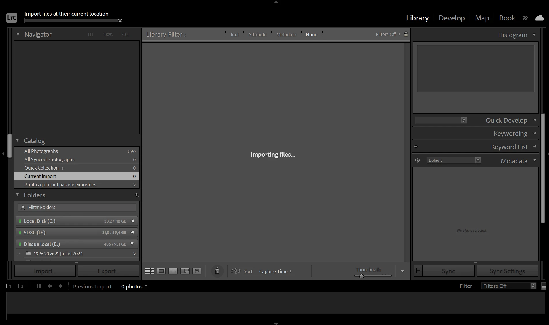 I cant import ANY photos anymore.. No matter which folder i choose in the import dialogue - i only see a little spinning animation in the bottom left and no file appears in the main window of the dialogue..