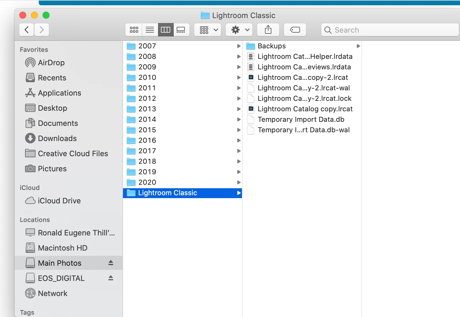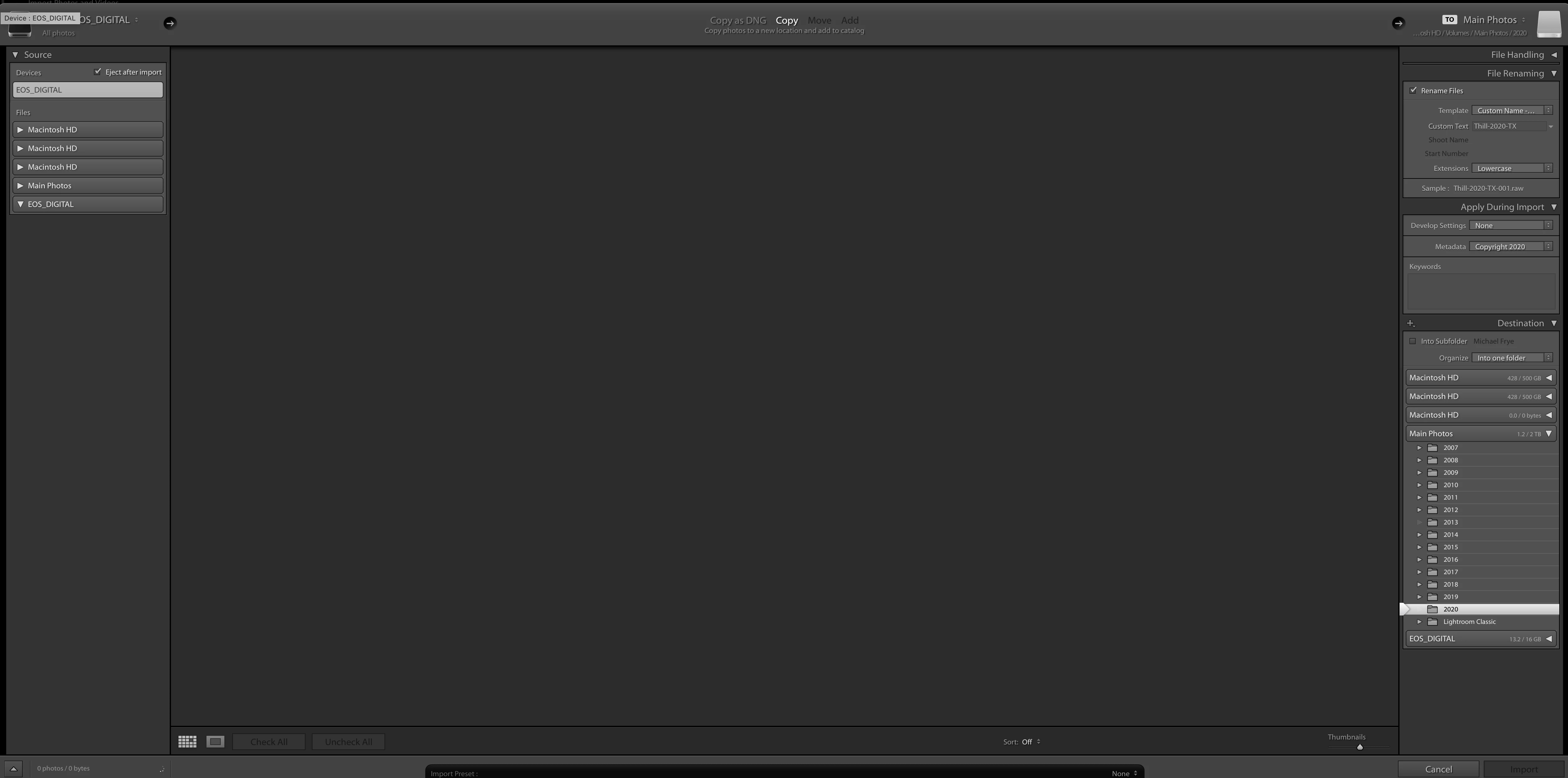 I'm trying to import some images from a compact flash card ("EOS_Digital") via a card reader to a new iMac running Catalina 10.15.3. This is the first Import for this new computer. I want these images stored on an external hard drive named "Main Photos" in the 2020 folder--not the Mac's internal hard drive (a smaller SSD drive that isn't large enough to hold all my images and LR catalog). Lightroom Classic 8.4.1 resides on the iMac's SSD. The external drive is connected to the iMac and appears on the Finder (right screenshot below). There's a tiny, partial spinning circle in the lower left box immediately to the left of the "Import Presets" tab (left screenshot below); its continuous spinning is trying to tell me something, but I've run out of ideas as to the cause. Everything looks like it should work, but the Import button remains grayed out.